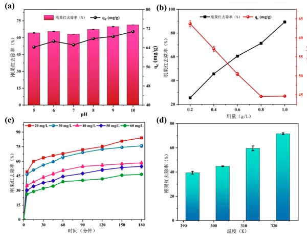 图2:吸附参数包括(a)pH值的影响,(b)剂量的作用,初始刚果红浓度的影响,以及(d)温度对刚果红在活性炭上吸附的影响。