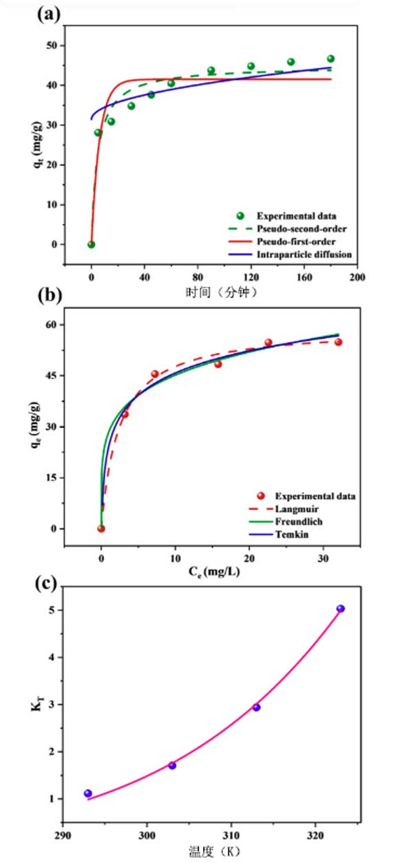 彩运cy888 图3:(a)吸附动力学,(b)吸附等温线和(c)van't hoff图,用于吸附Cr上的活性炭上。