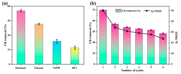 图4:(a)使用不同的解吸剂后,cr的活性炭的吸附效率;(b)甲醇在六个连续吸附-吸附周期内通过甲醇的吸附效率。