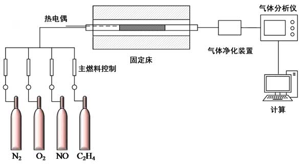 催化测试的实验装置如图1所示。将每种活性炭样品放入固定床石英管反应器中,该反应器由温控炉外部加热。气体流速通过质量流控制器控制,与模拟气体混合物调节至500ppm NO,500ppm的乙烯,3.0%(体积)Ò 2和N 2为平衡流量,总流量为1500 ml/min。在每个测试的催化剂温度达到稳定的设定点之后,将气体混合物注入反应器中。进出气中NO和NO X的浓度用烟气分析仪分析。下标的进和出分别指示入口和出口的浓度。