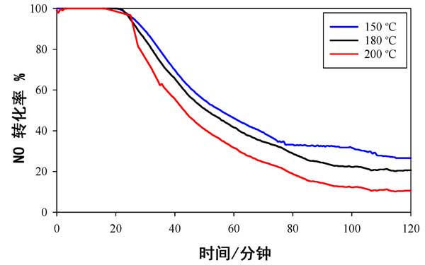 使用活性炭载锰氧化物催化剂时,不同温度下NO转化率数据与时间的关系如图2所示。它用于提供可以与以前发布的数据进行比较的基线数据。在所有温度(150°C,180°C和200°C)的前20分钟内,几乎有100%的NO转化发生,但在此初始阶段后NO转化迅速下降,并且在2小时的测试后,转化率不足20%。活性的温度依从性依次为150°C>180°C>200°C。