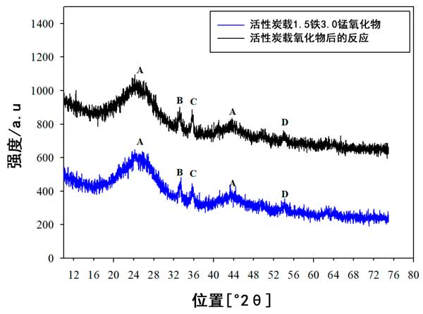 来自活性炭载铁锰氧化物的XRD数据显示在图5中,其中已鉴定出主要峰。在2θ=24°和2θ=43°处的宽峰(标记为A)与无定形碳的峰一致。它们的位置和宽度在新鲜和经过测试的催化剂中都相同,这表明活性炭无定形结构的稳定性。在新鲜催化剂和测试催化剂中,在2θ=33.5°,2θ=35.1°和2θ=54.3°处分别出现了另外三个峰(分别标记为B,C和D),并且位置或峰强度没有明显变化作为反应测试的结果。2θ=33.5°(峰标记为B)处的峰归因于Fe 2 O 3 和在2θ=35.1°和54.3°的峰归因于Fe 3 Mn 3 O 8,尽管在新鲜和测试的催化剂中这些与铁有关的峰的强度和宽度相同,但是由于XRD峰较弱,因此很难确定在测试过程中铁和锰的结晶度是否发生了变化。然而,结合的铁氧化物与锰氧化物确实原因形成Fe 3的Mn 3 ö 8固体溶液,其可在的活性炭载铁锰氧化物催化剂的NO转化。