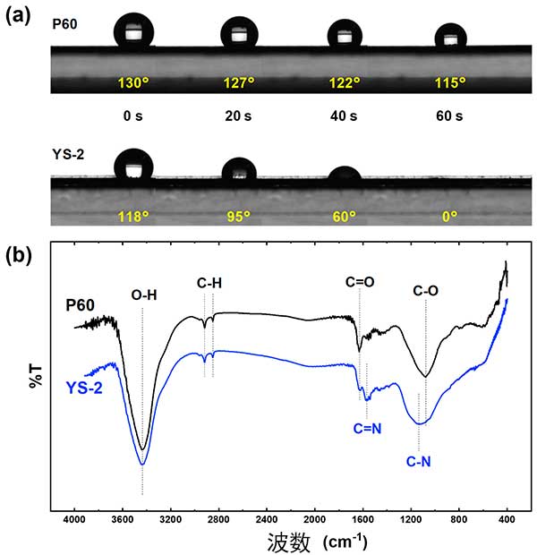 图1:(a)用疏水和亲水活性炭制造的两个电极的接触角随时间变化,以及(b)两种活性炭的FT-IR光谱。