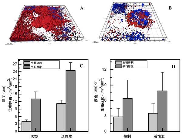为了分析由于在膜生物反应器中添加活性炭而导致生物膜形成增加的可能性,并进一步阐明活性炭反应器中膜性能下降幅度更大的原因,在第一个处理结束时进行了检测(图2A,B)。在比较两个反应器之间生物膜结构的性质时,可以观察到活性炭反应器通量下降的增加显然与生物膜生长的幅度有关。在第一次膜生物反应器运行结束时从模块上获取的两块膜上生物膜的CLSM分析显示,活性炭和对照反应器之间细胞的生物体积及其自相关EPS的差异很大(图2)。当补充活性炭时,生物膜生长的升高支持了膜渗透性的更高降低,这是由可溶性微生物组分吸附的升高引起的,这可能会更好地调节膜表面,从而增强生物膜的形成。