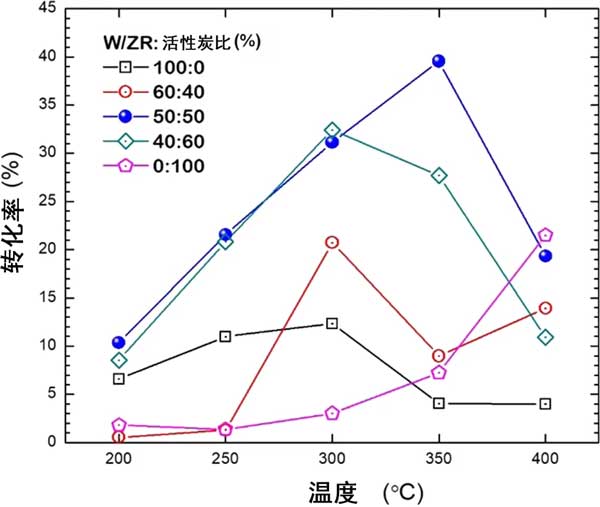 彩运cy888 在这一部分中,双载体体系包含氧化锆,与单独使用氧化锆或活性炭的单载体体系相比,研究了通过物理混合方法制备的活性炭对钨催化剂的影响。