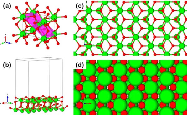 图3:氧化锆呈四方形结构,具有(a)高亮表面,(b)真空度为10Å的平板模型,球棒表面的俯视图,(c)和空间填充视图,(d)绿色和红色原子分别是Zr和O。
