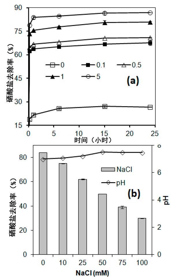 图2:(a)铜涂层剂量[0,0.1、0.5、1.0和5.0 mmol 的载铜活性炭]对硒酸盐吸附的影响,(b)溶液对硒酸根在铜包被的活性炭上的吸附的离子强度,以及吸附后溶液的pH,初始pH约为7.0。