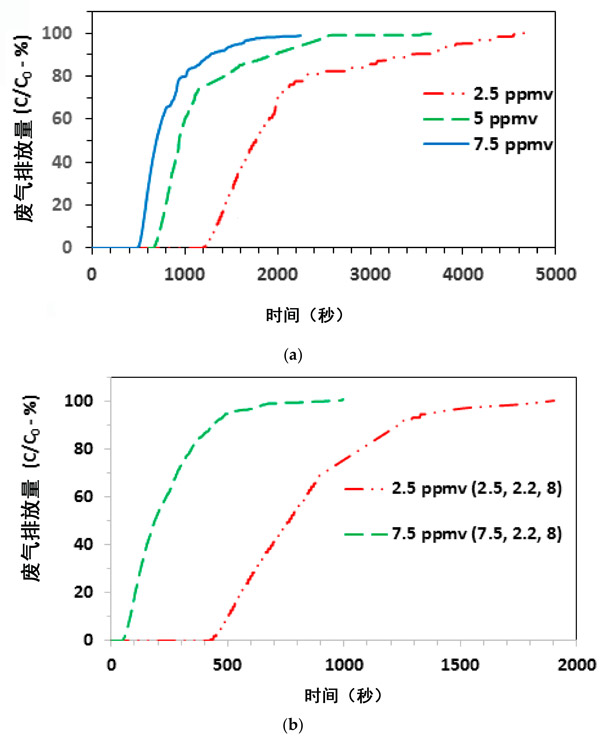 图2:进水氨气浓度对活性炭上氨气吸附突破曲的影响。