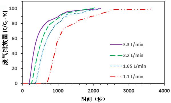 彩运cy888 本研究还使用基于数据坑的活性炭研究了气体流速对氨吸附的影响。图3提供了1.1至3.3 L/min的气体流速的相应结果。通常,氨气流量的逐渐增加也会导致相应的穿透时间和排气时间响应逐渐减少(图3)。例如,流量为1.1、1.65、2.2和3.3 L/min时的突破时间分别为712、383、272和197 min(图3)。因此,较高的突破时间值在较低的氨气流速下蒸发。此外,对于1.1、1.65、2.2和3.3 L/min流量研究,还分别记录了2312、1673、1315和1213分钟的排气时间。这类似于上述突破时间趋势,可以解释如下。在较低的流入气体流速下,氨分子从气相到活性炭表面的传质速率也相对较小。因此,与较高气体流速下的活性炭表面部位相比,单位时间内所占据的活性炭表面部位也更少,产生更高的穿透时间和耗竭时间响应(图3)。这些发现对于实际应用尤其重要。