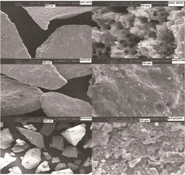 图2显示了吸附剂的SEM图像。活性炭晶粒的撕裂边缘也显示出内部“孔”。其内部结构可以被认为是碳板的石墨型分层。活化过程中产生的孔隙和大量碎屑导致了这种吸附剂的易碎性。AAFS晶粒显示出相同的倾斜形状,表面看起来光滑且具有均匀的涂层。在更大的范围内,仅可见很少的裂缝或孔洞,这表明表面积主要在外部。β-FeOOH的表面具有高脆性,因此表面光滑且带有大量碎屑。多孔结构与SEM照片非常吻合(图2),说明了活性炭的片状结构及其众多的空洞,而铁化合物则显得光滑,只有很少的裂纹。活化过程中产生的孔隙和大量碎屑导致了这种吸附剂的易碎性。考虑规模,中孔和大孔上看到照片(尺寸以上2.5 μ M)。β-FeOOH的表面易碎,因此表面光滑,带有大量碎屑。该刻度不允许人们区分赤霞石微晶(FeOOH的β形式)的特征杆雪茄形状。