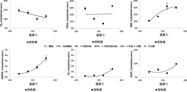 由于使用活性炭整料进行糠醛连续氢化以合成糠醇,四氢糠醇和环戊酮的工作很少,我们希望确定温度和压力对选择性和时空产率或转化率的影响。因此,在一组实验中,采用活性炭催化剂来确定温度对糠醛氢化的影响。在所有温度下,活性炭整料的糠醛转化率均高于90%。活性炭整料的高碳封闭率是在180°C时达到的(约90%)。升高温度会降低糠醇的选择性,并提高除四氢糠醇以外的所有产品的选择性(图2)。