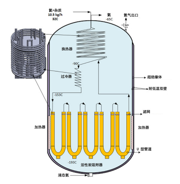 低温吸附器经过专门设计,可消除氦气中的杂质,例如O2,N2和气态裂变产物,这些杂质通常很难去除。基于活性炭柱上可逆的低温捕集,所有这些杂质都是干净的。如图1所示的设备由三个主要部分组成,即混合气体容器,低温装置和纯氦储罐。