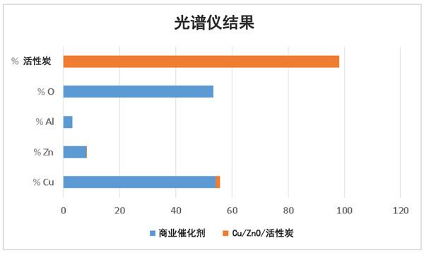 活性炭催化剂的制备,采用浸渍法制备了Cu/ZnO/活性炭催化剂。硝酸铜和硝酸锌是将附着在活性碳上的铜和氧化锌载体的原材料。Zn起促进剂的作用,以防止Cu的烧结。铜将在催化剂上被氧化并写为铜[Zn]。之后,来自CuO分子将为CuO/ZnO相的形式。其还原将受到ZnO的影响。制备活性炭催化剂后,然后通过XRF,XRD,SEM和BET表面积分析仪对催化剂进行表征。商业催化剂和Cu/ZnO/活性炭催化剂的XRF分析见图2。