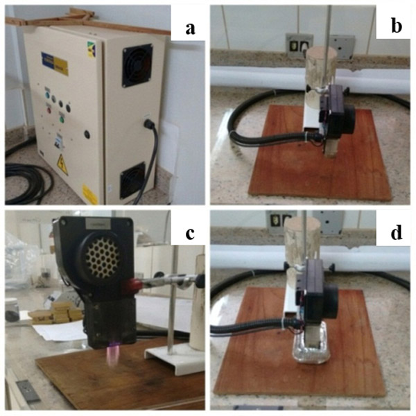 图1:电击设备(a)控制箱、(b)电击头、(c)排放头、(d)表面处理布置。