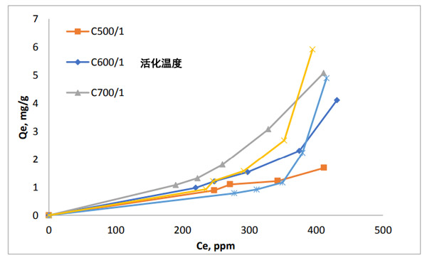 图3显示了钙离子的吸附等温线。等温线表示分类的I型或II型。较低溶液浓度下的小肩部可能暗示了钙离子微孔填充的单层吸附饱和。这表明孔表面与钙离子之间的相互作用较强。活性炭的低孔隙度仍表示III型等温线,因为没有明显的微孔可以被钙离子填充,而不是外表面和大孔。