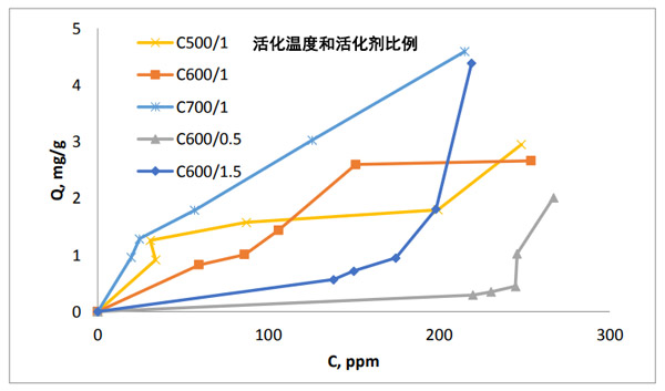 从图2中可以看出,活性炭在不同的活化温度(500℃,600℃和700℃)和活化剂比率(0.5、1.0和1.5)下的锂吸附等温线。似乎在较低浓度下吸附能力相对较低。这表明锂离子对活性炭表面的亲和力低。高浓度下容量的增加与孔隙率成正相关。活性炭的较大表面积倾向于更多地吸附锂离子。在等温线的分类中,该等温线被认为是III型等温线,对于无孔或大孔吸附剂来说是典型的。因此,锂离子似乎不附着在微孔内部,而是附着在外部和大孔表面。活性炭对锂离子的亲和力低。炭表面的碳原子与溶液中的锂离子之间的低相互作用可能是由于离子的原子质量低所致。原子间势相互作用表明该力与相互作用原子的原子质量以及原子之间的距离具有正相关。