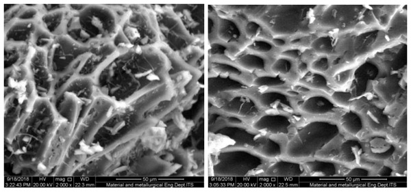 通常,由碳化过程形成的活性炭具有粗糙的表面结构,其孔径不会太大以至于会影响吸附能力(图1)。粒度和表面积对吸附剂很重要,因为粒度会影响吸附能力。由该图可知,通过RSS碳化处理得到的活性炭的孔径为40μm左右,未改性,使用活化液进行改性后,为<20μm。这表明,活化液的浸渍在孔的形成中起着重要的作用。促进更多的孔隙形成。总表面积影响总吸附容量,从而提高吸附剂去除废水中有机化合物的效率。
