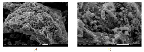 图1:活性炭的SEM图像,放大率(a)为1000x,(b)为2500x。