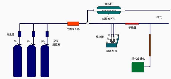 实验装置如图1所示。使用单因素实验研究活性炭剂量,氧气含量和烟道气流速对活性炭吸附的影响。将一定量的吸附剂放在15×150 mm的U形管中,并在混合气流下(在恒定混合气体中含有2000 ppm 二氧化硫,一定量的氧气)在60°C的水中加热。,并用氮气平衡二氧化硫的量用便携式烟气分析仪分析废气中的废气。计算吸附剂活性炭的脱硫效率,从而确定了合适的吸附条件。