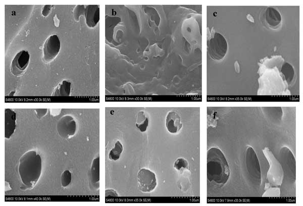 彩运cy888 图2:在0(a),2(b),4(c),6(d),8(e),10(f)循环数后经过再生处理的活性炭的SEM图像。