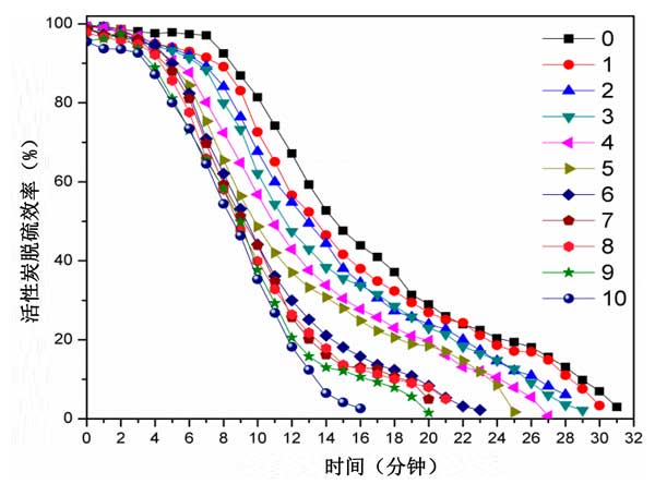 图3:再生活性炭的脱硫效率,其中0-10代表循环数。