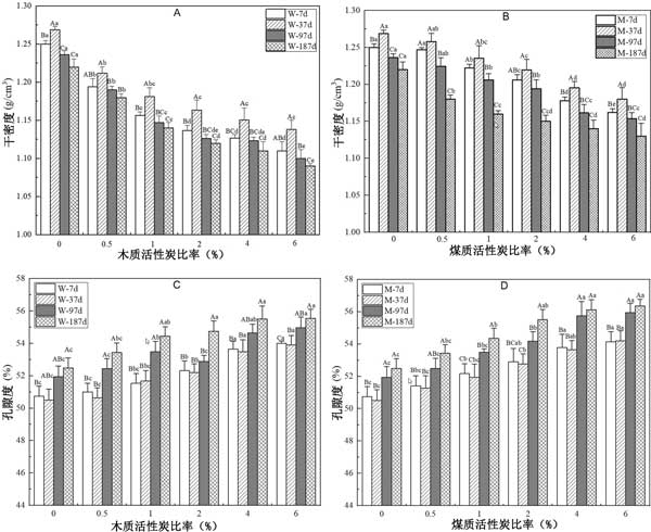 图2:活性炭对植被混凝土干密度(A,B)和孔隙率(C,D)的影响。