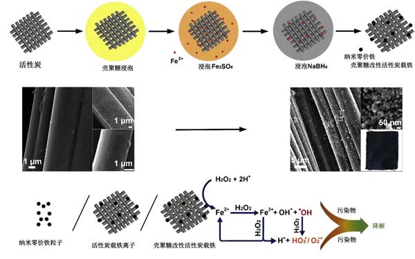 本次一共制备了三种类型的非均相Fenton催化剂,分别是纳米零价铁颗粒,活性炭负载的纳米零价铁和浸渍有纳米零价铁的壳聚糖改性活性炭。通过在活性炭上吸收铁离子,然后使用NaBH 4原位还原,合成了活性炭负载的纳米零价铁。壳聚糖改性活性炭的制备方法是,先在酸洗过的活性炭上涂覆一层壳聚糖,然后将亚铁离子螯合到壳聚糖基质中,然后将其原位还原为纳米零价铁。这几种活性炭催化剂的合成过程示意图如图1所示。