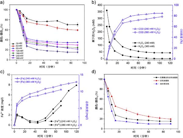 彩运cy888 为了了解活性炭在处理合成类黑素废水中的反应机理,在初处理240 mM和360 mM H 2 O 2的过程中,测量了废水处理过程中未消耗的H 2 O 2浓度。图2b显示,残留的H 2 O 2浓度在20-25分钟后迅速下降,影响了Fenton样过程的效率。在使用240 mM H 2 O 2下会在90分钟后被消耗掉,并且该时间可以被认为是终止类芬顿反应的反应时间。完全消耗H 2 O 2后,可以大程度地去除颜色(图2a)。