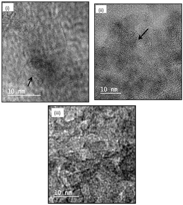 进行了镍钼硫化催化剂的TEM分析,以收集有关硫化钼在载体上的分散性的信息。TEM图像如图1所示。对于氧化铝和活性炭催化剂,在二氧化硅催化剂中未观察到MoS 2条纹。氧化铝催化剂中会明显出现两到三层MoS 2堆叠,可能是II型活性位。然而,这种类型的活性位点对于活性炭负载的催化剂是不可见的。氧化铝催化剂的计算平均平板长度为3.19nm。较大的平均平板长度可能与氧化铝催化剂中较弱的金属-载体相互作用有关。