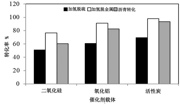 彩运cy888 使用原油中的真空残留物作为原料,在间歇反应器中评估了加氢处理活性。因为所有反应都是在几乎相同的条件下进行的,所以转化率的差异主要归因于所用催化剂的性质。原料的性质包含高沥青质(22%),硫(5.45%)和其它金属含量。在图2中,已经提出了不同催化剂的加氢处理活性,使用活性炭,二氧化硅和氧化铝为载体的催化剂获得的加氢脱硫转化率分别为70%,58%和61%。负载在氧化铝上的催化剂具有高的加氢脱硫转化率。