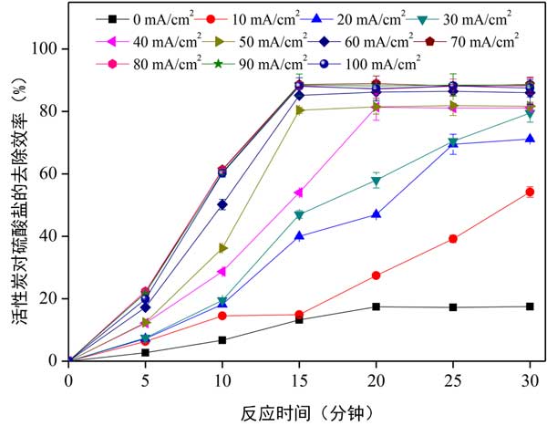 电流密度是一个关键参数,它不仅影响凝结剂的用量,还影响气泡的形成速率,气泡的大小和絮凝物的生长。各种选定的电流密度:0、10、20、30、40、50、60、70、80、90和100mA/cm2在批量实验中应用了,以建立电凝与活性炭耦合过程的有利电流密度范围。在30分钟的反应时间下使用铝不锈钢阳极/阴极电极对进行连续电凝工艺,并使用反应器中的活性炭浓度为0.2g/L来研究电流密度对硫酸盐的影响去除效率。与活性炭吸附工艺相比,电凝加活性炭即使在低电流密度(10mA/cm2)时也可以显着提高去除效率。如图2所示,活性炭吸附过程和电凝活性炭吸附偶联过程的去除效率在5分钟时分别为2.7%和6.3%,在30分钟时分别为17.5和54.2%。由于偶合体系中的反应比简单的活性炭吸附过程更复杂,因此去除效率有所提高。电凝结合活性炭吸附对硫酸盐去除效率有重要影响。结果表明,去除效率随着电流密度的增加而显着提高。电流密度为70mA/cm2时,去除效率最高(88.9%)。这种现象可以归因于这样的事实,即在高电流密度下,氧化金属的数量增加,从而导致大量的Al(OH)3(s)颗粒有利于去除污染物。