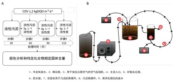 图1:(A)实验方法流程图,(B)用粉状活性炭活化的污泥系统。