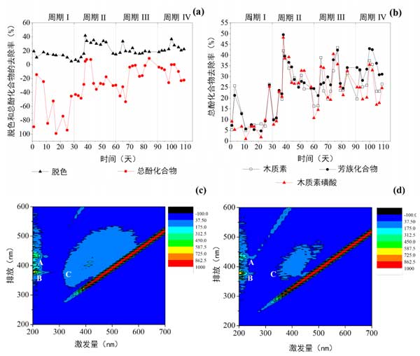 图2:(a)去除颜色和总酚类化合物。(b)去除木质素,芳族化合物和木质素磺酸化合物。(c)富集的荧光发射和激发矩阵。(d)废水排放和荧光激发矩阵。