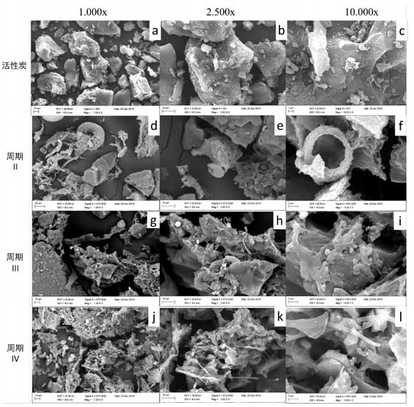 观察图3所示的图像,处理期间生物量显着增加,其中存在大量生物材料,可能的丝状形成和微生物团聚,表明存在较大量步骤IV中的生物量。至于生物膜的发展,观察显微照片增加了10,000倍(图3C,3I和3L),注意到附着在活性炭表面的微生物的生长。这些可能是细菌,真菌和丝状细菌,活性炭在反应器运行110天后,固体样品中的细菌含量更高。