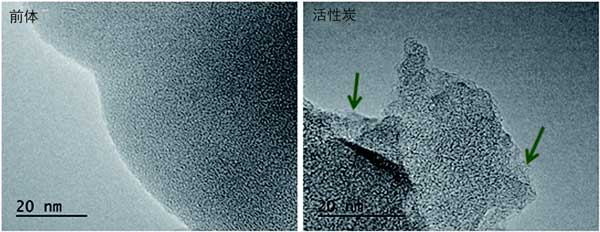 图1:前体材料(左)和活性炭(右)的TEM图像。