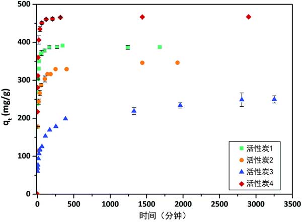 图2:活性炭在25°C时异丙甲草胺的吸附量随接触时间的变化。