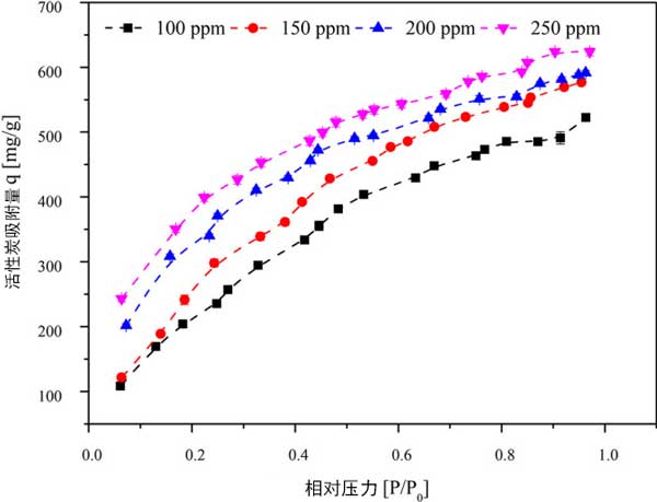 彩运cy888 为了确定三氯乙烯初始浓度在进料流中的影响,研究了100、150、200和250ppm的浓度。维持其他实验条件,活性炭颗粒大小为355μm,床温为30°C,活性炭重量为50mg。入口浓度为100、150、200和250ppm时的吸附容量分别为523.252、575.844、593.181和624.044mg/g。随着入口三氯乙烯浓度的增加,在压力增加的情况下,活性炭的吸附容量显示出稳定的增加。在较高浓度下,随着压力的增加,吸附容量的增加可能是由于相邻分子与微孔中的层内分子粘附所致。这导致形成粘附在吸附剂表面上的层内分子的相邻三氯乙烯分子堆叠。三氯乙烯分子的平面形状的动力学直径为6.6。因此,它会积聚在活性炭的微孔/中孔上。在活性炭的微孔区域中具有大孔体积的情况下,假设缝隙形状的孔几何形状,则期望对活性炭上的三氯乙烯具有高亲和力。在低浓度(0-8000μg/L)的活性炭上进行了三氯乙烯的吸附,在室温下吸附量为160mg/g。