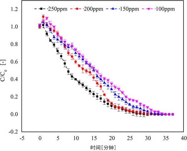图2:改变进气中三氯乙烯的初始浓度对活性炭吸附能力的影响。