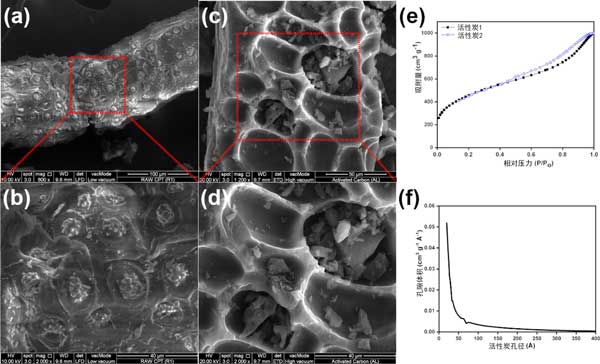 图1:(a,b)一般活性炭和(c,d)新活性炭的扫描电子显微镜图像和各自的放大倍数;(e)新活性炭的N2吸附-解吸等温线,(f)由N2等温线分析得出的孔径分布。