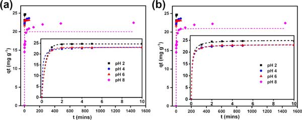 图2:通过非线性(a)伪一阶模型和(b)伪二阶模型拟合在4、2、4、6和8的四个不同溶液pH下的实验吸附动力学数据。实验数据用点表示,等温线拟合用虚线表示。