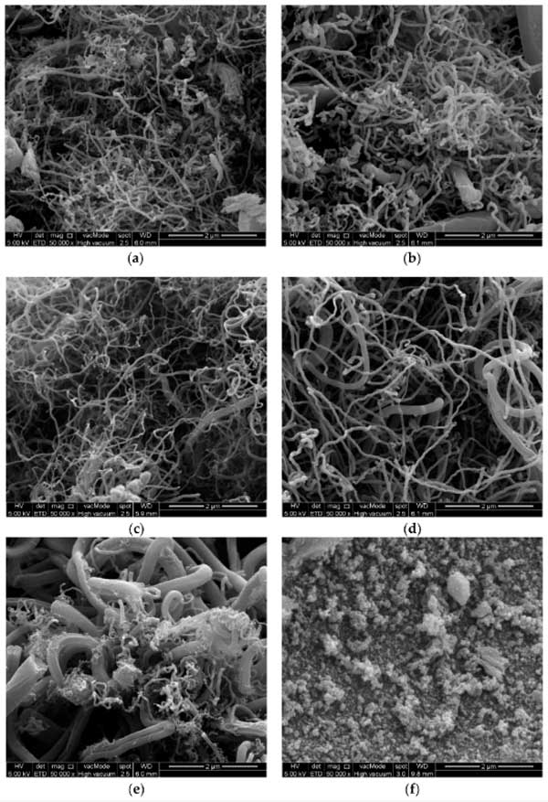 用FESEM技术分析了合成样品的形态特征。图2a-f显示了放大的50,000倍的六个选定活性炭样品图像。图2c显示了活性炭5的FESM图像,通过使用5%的铁作为单催化剂和40分钟的反应时间,发现炭产率和接触角较高。在此样本中发现了两种类型的碳纳米材料,分别是碳纳米纤维和多壁碳纳米管。图2f显示了活性炭3的FESEM图像,该图像是通过使用4%的钴作为单催化剂和40分钟的反应时间制备的。发现仅使用大量的钴作为催化剂产生非常差的炭产率,这表明材料制备得不怎么好。图2e显示了活性炭4的FESEM图像,该图像是通过使用5%的铁和4%的钴作为双金属催化剂制备的,反应时间为40分钟。该图像表明,使用大量的钴和铁时,主要生成聚集的炭纳米材料和碳纳米纤维,因为这样的实验条件不是优选的。