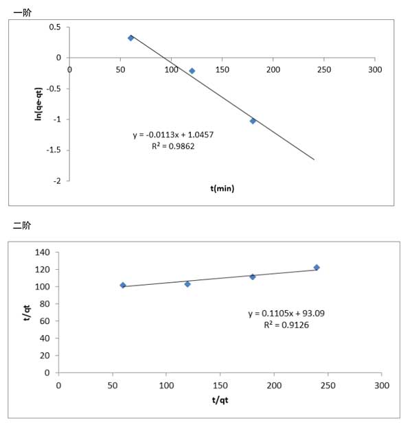 图3:活性炭吸附柴油脱硫的一阶动力学和二阶动力学。