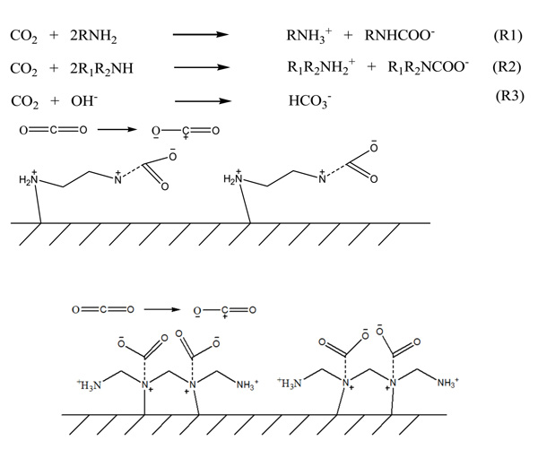 图2:胺官能化活性炭表面上的乙二胺和三亚乙基四胺与二氧化碳之间的拟议反应机理。