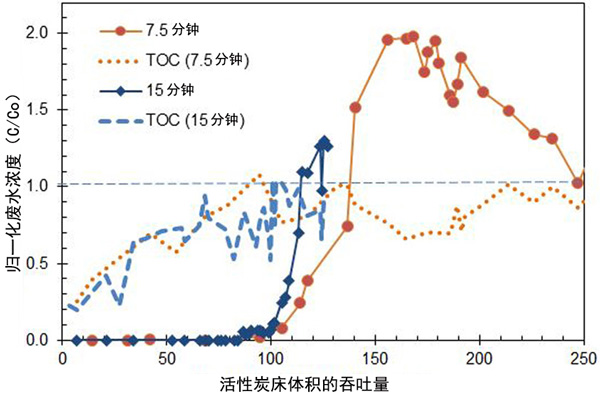 大位移解吸的一个例子可见于图1用于123-三氯丙烷。空床接触时间(EBCT)7.5分钟色谱柱产生一个大的C/C0峰,流出物浓度为13μg/L,几乎是进样浓度的两倍,这是由于位移脱附所致。15分钟的EBCT色谱柱在100%穿透后不久即中断,因此未获得峰置换浓度。虽然溶解有机物突破,由TOC测量,在大约65000个床体积达到75%时,可能仍然被去除溶解有机物的一个小孔吸附级分。在活性炭吸附过程中吸附良好的溶解有机物组分与吸附的VOC竞争,并引起位移。即使此吸附良好的溶解有机物分数仅为进水TOC的5%,其浓度仍为50μg/L,是VOC浓度的10倍。