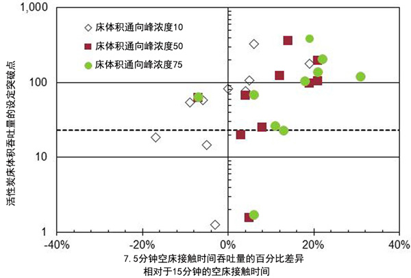 图2:空床接触时间对吞吐率的影响达到10%,50%和75%的突破。