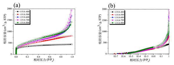 彩运cy888 图1:活性炭的等温线吸附-解吸曲线随各种磷酸活化温度的变化(a)正常和(b)对数。
