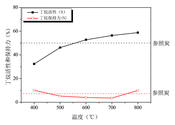 彩运cy888 图2:活性炭的丁烷工作容量能力随各种磷酸活化温度的变化而变化。