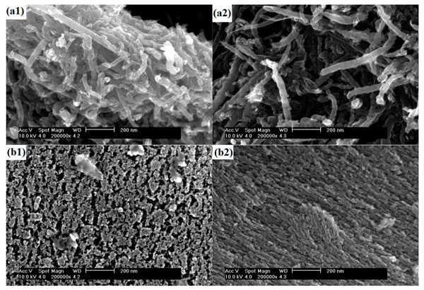 图1:(a1):活性炭纳米管载钴,(a2):活性炭纳米管,(b1):活性炭载钴催化剂,(b2):活性炭。