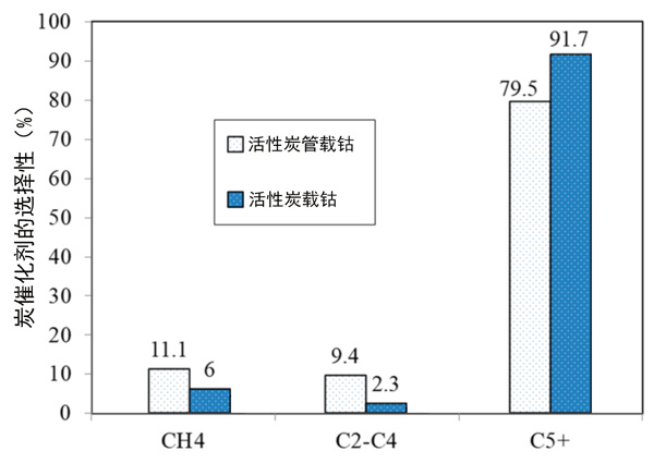 彩运cy888 费托合成试验是在210℃和2.5MPa的内径为12mm的不锈钢固定床管式反应器中进行的。将0.5g催化剂与5.0g碳化硅稀释剂的反应混合物装入反应器中。催化剂在425℃下在N2中的33vol%H2中原位还原10小时。还原后,将反应器冷却至180℃,并将H2/N2气体混合物切换为合成气(H2:CO为2∶1)。在合成气加压至2.5MPa然后在4小时内重新加热到210°C来完成反应。活性炭载钴催化剂,活性炭纳米管载钴催化剂的CO转化率分别为13.1%,6.7%。产物选择性的结果在图2中给出。与活性炭管样品相比,活性炭产生更高的C5+和更低的CH4选择性,这对气体产物(C1-C4)也产生最高的选择性。