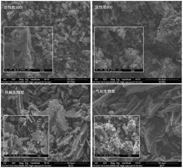 彩运cy888 图2:研究的1000碘值活性炭,800碘值活性炭,热解生物炭和气化生物炭样品的SEM图像。子图是较高放大倍数的SEM图像。